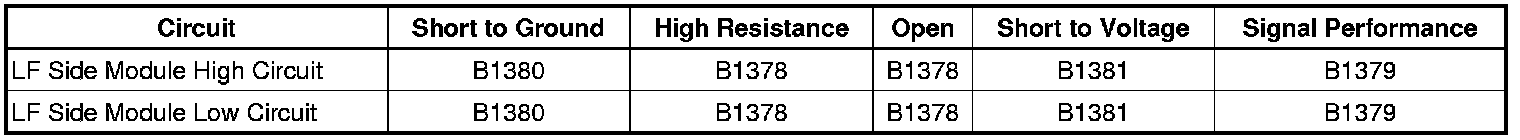 If a malfunction is detected, a DTC will be stored in non-volatile memory. During a side or frontal crash of sufficient force the inflatable restraint sensing and diagnostic module (SDM) will allow current to flow through the deployment loop in order to deploy the LF side module. The SDM performs continuous diagnostic tests on the deployment loops to check for proper circuit continuity and for shorts to ground or voltage. A shorting bar used within the LF side module connector which will short together both LF side module high and low circuits when the connector is disconnected. This will help to prevent unwanted deployment of the inflator module during servicing.