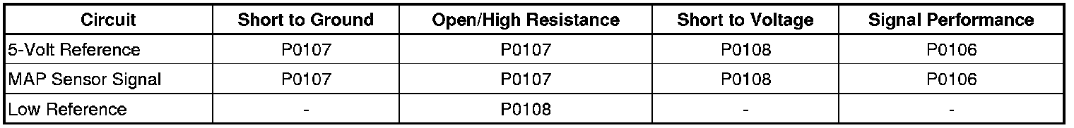 The manifold absolute pressure (MAP) sensor responds to pressure changes in the intake manifold. The pressure changes occur based on the engine load. The engine control module (ECM) supplies 5 volts to the MAP sensor on the 5-volt reference circuit. The ECM provides a ground on the low reference circuit. The MAP sensor provides a signal to the ECM on the MAP sensor signal circuit which is relative to the pressure changes in the manifold. The ECM detects a low signal voltage at a low MAP, such as during an idle or a deceleration. The ECM detects a high signal voltage at a high MAP, such as the ignition is ON, with the engine OFF, or at a wide open throttle (WOT). The MAP sensor is also used to determine the barometric pressure (BARO). This occurs when the ignition switch is turned ON, with the engine OFF. The BARO reading may also be updated whenever the throttle position (TP) sensor is greater than 28 percent.