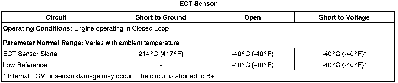 The engine coolant temperature (ECT) sensor is a variable resistor that measures the temperature of the engine coolant. The engine control module (ECM) supplies 5 volts to the ECT signal circuit and supplies a ground to the low reference circuit.