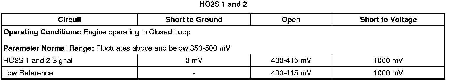 The heated oxygen sensors (HO2S) are used for fuel control and catalyst monitoring. Each HO2S compares the oxygen content of the surrounding air with the oxygen content of the exhaust stream. When the engine is started, the control module operates in an Open Loop mode, ignoring the HO2S signal voltage while calculating the air-to-fuel ratio. The control module supplies the HO2S with a reference, or bias voltage of about 450 mV. While the engine runs, the HO2S heats up and begins to generate a voltage within a range of 0-1,000 mV. This voltage will fluctuate above and below the bias voltage. Once sufficient HO2S voltage fluctuation is observed by the control module, Closed Loop is entered. The control module uses the HO2S voltage to determine the air-to-fuel ratio. An HO2S voltage that increases above bias voltage toward 1,000 mV indicates a rich fuel mixture. An HO2S voltage that decreases below bias voltage toward 0 mV indicates a lean fuel mixture.