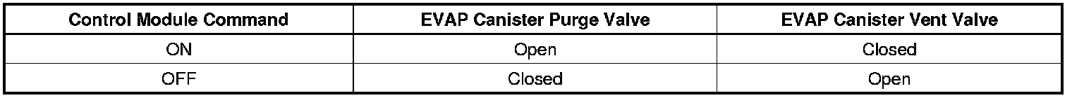 The following table illustrates the relationship between the ON and OFF states, and the OPEN or CLOSED states of the EVAP canister purge and vent valves.