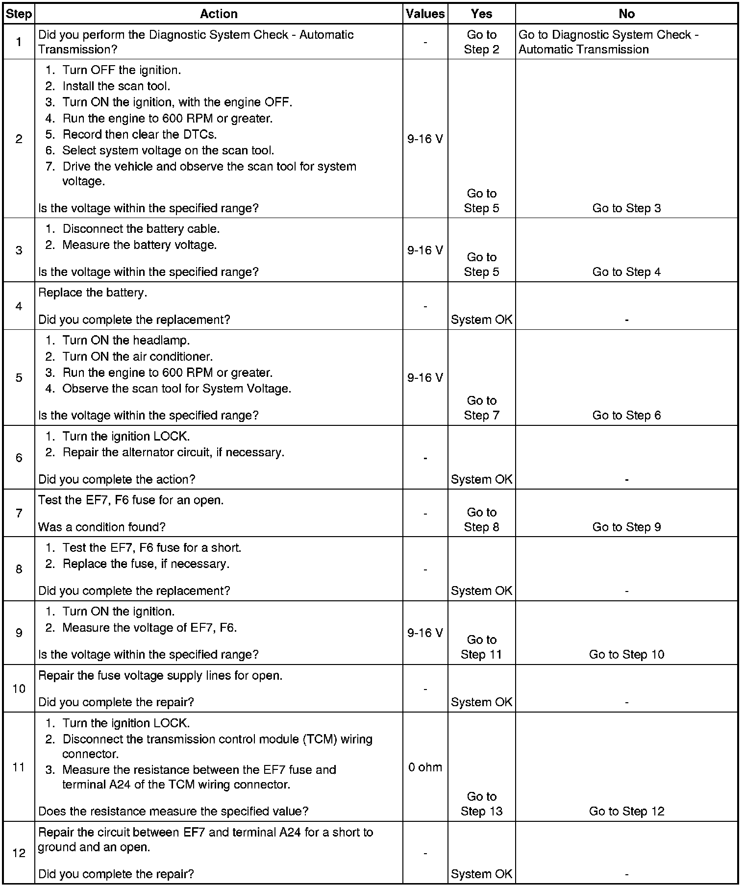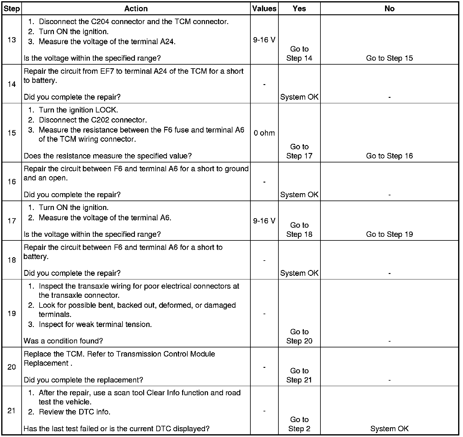 * The transmission control module (TCM) detects that the voltage is greater than 18 volts for 0.5 second continuously.