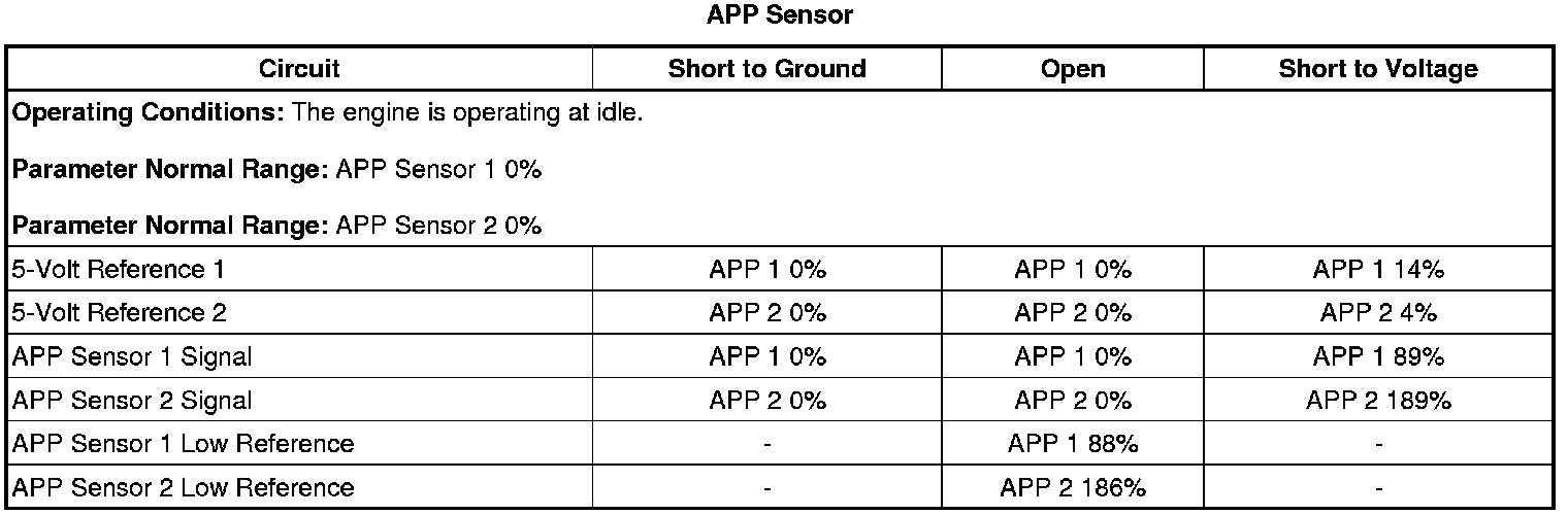 The accelerator pedal assembly contains 2 accelerator pedal position (APP) sensors. The APP sensors are mounted to the accelerator pedal assembly and are not serviceable. The APP sensors provide a signal voltage that changes relative to pedal position. The engine control module (ECM) supplies each APP sensor with a 5-volt reference circuit, a low reference circuit, and a signal circuit.