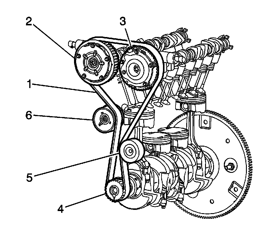The crankshaft is connected to the intake and exhaust cam shafts by using a timing belt (1). An automatic tensioner (2) and idler puller (4) maintain proper belt tension and increase the wrap angles around the drive gears.