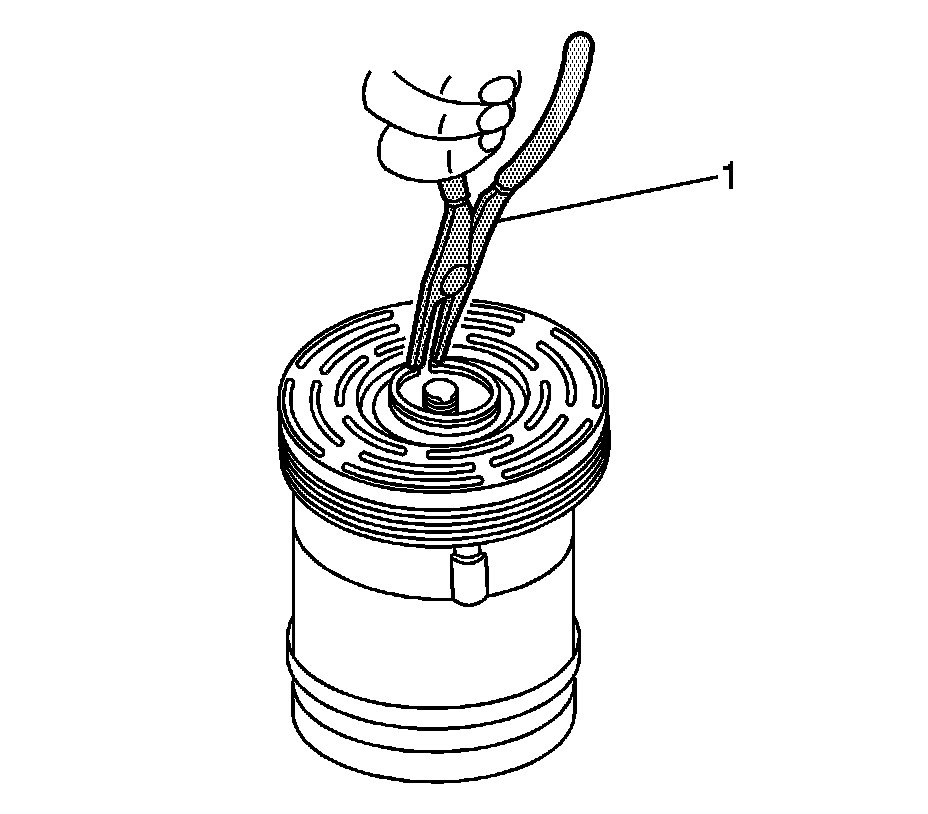 4. Remove the clutch drive plate and hub assembly. Refer to Compressor Clutch Plate and Hub Assembly Removal (V5 Compressor) (Compressor Clutch Plate and Hub Assembly Removal (V5 Compressor))Compressor Clutch Plate and Hub Assembly Removal (SP10 Compressor) (Compressor Clutch Plate and Hub Assembly Removal (SP10 Compressor)).