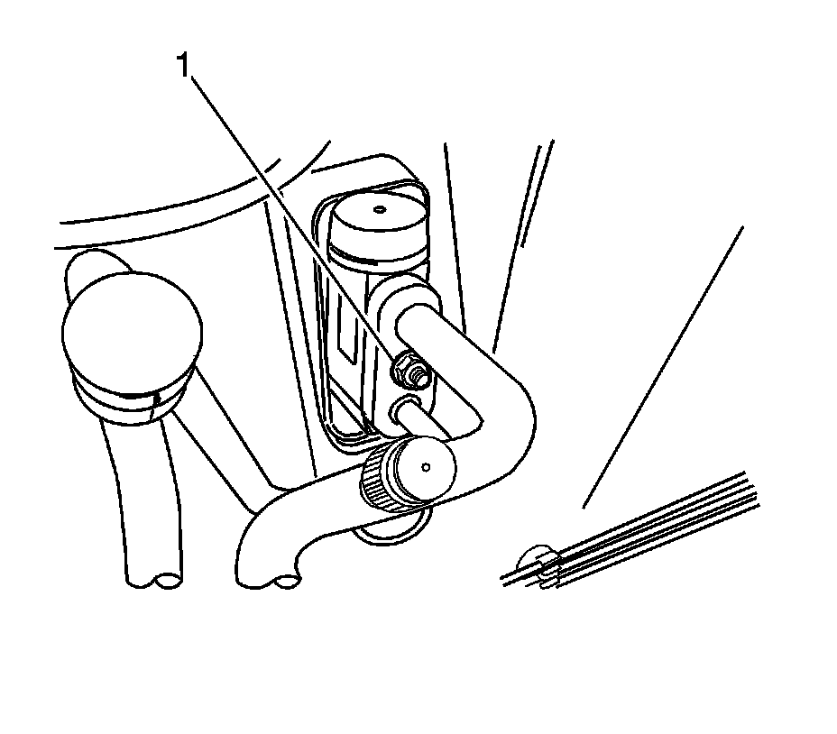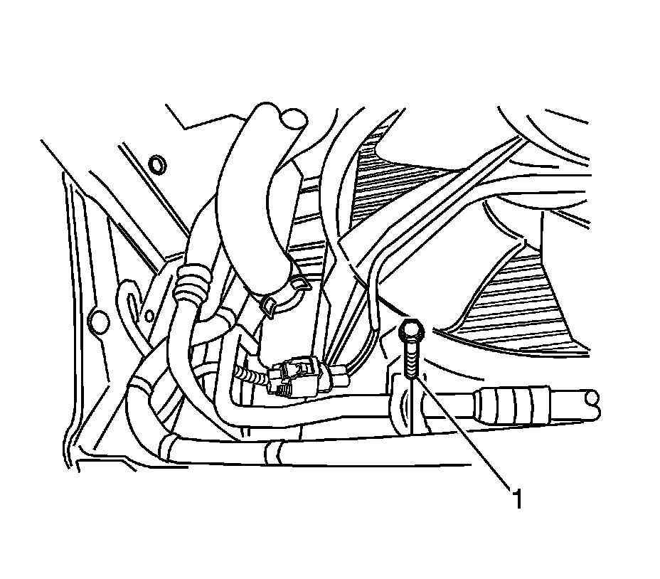 11. Remove the refrigerant discharge hose connector block bolt (1) at the condenser.