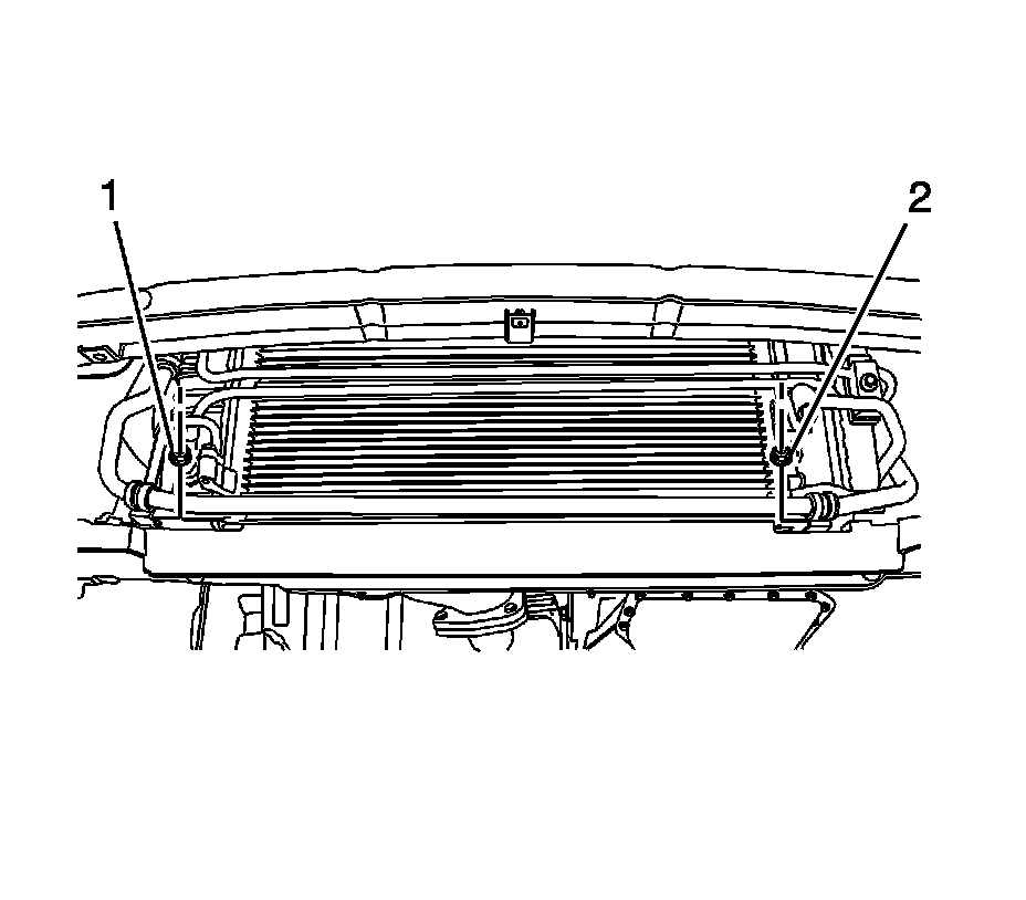 4. Remove the suction pipe retaining clamp nuts (1, 2) under the radiator.
