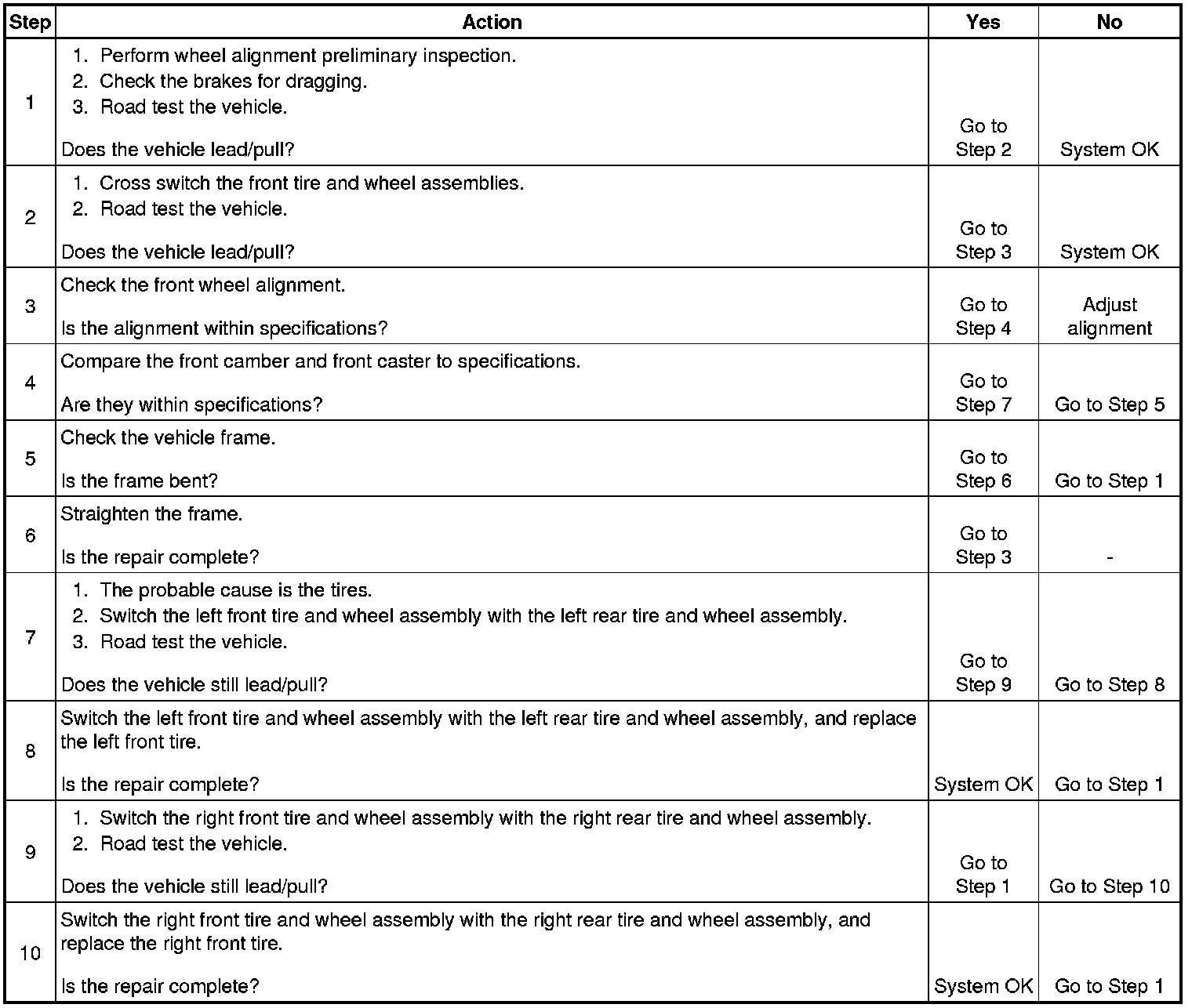 The radial lead/pull diagnosis chart should be used to determine whether the problem originates from an alignment problem or from the tires. Part of the lead diagnosis procedure calls for tire rotation that is different from the proper tire rotation pattern. If a medium-mileage to high-mileage tire is moved to the other side of the vehicle, be sure to check for ride roughness. Rear tires will not cause lead/pull.