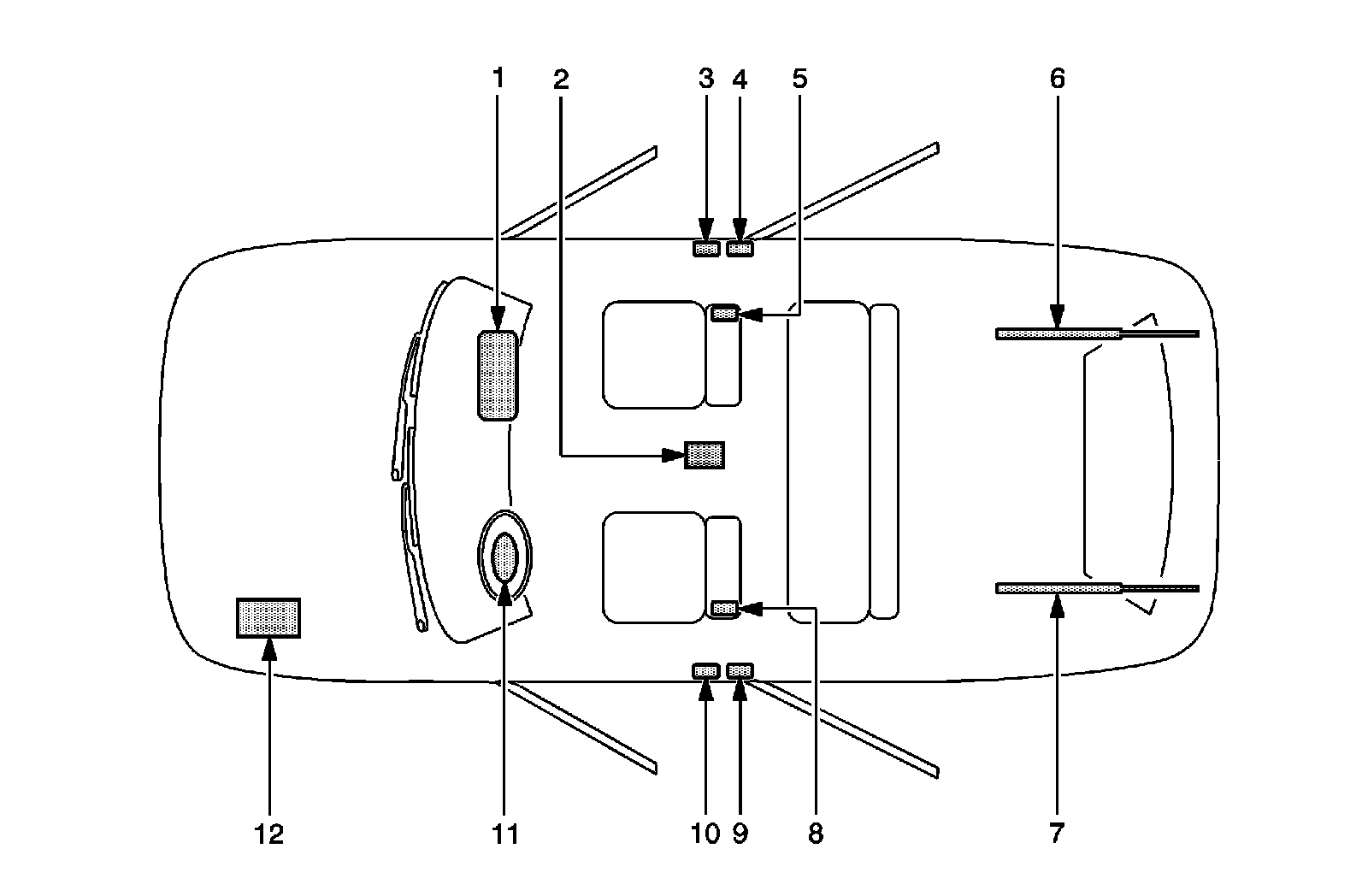 The SIR Identification Views shown below illustrate the approximate location of all SIR components available for the vehicle. This will assist in determining the appropriate SIR Disabling and Enabling for a given service procedure, refer to SIR Disabling and Enabling (Service and Repair).