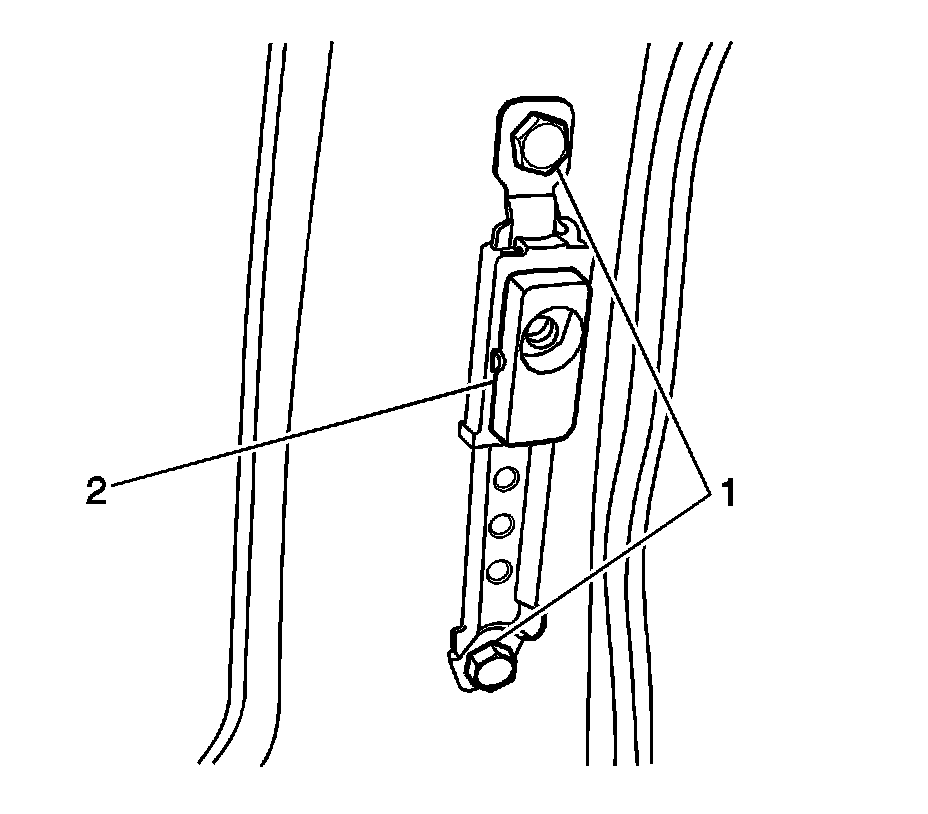 1. Install the seat belt height adjuster (1) with the bolts (2) and tighten to 27 Nm (20 lb ft).