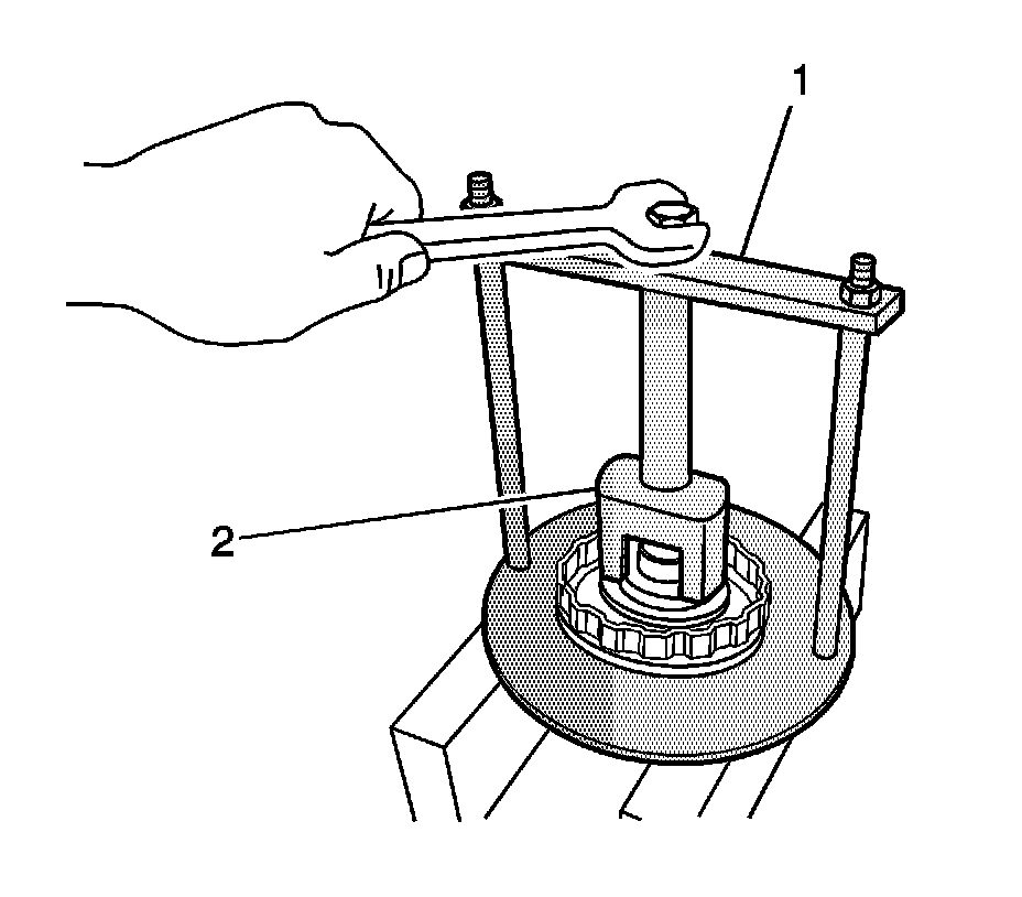 5. Place DT 46451 (1) and DT 46453 (2) on the direct clutch return spring and compress.