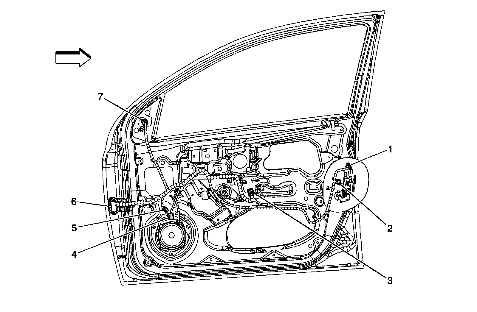 Front Door Harness Routing (Driver Shown, Passenger Similar)