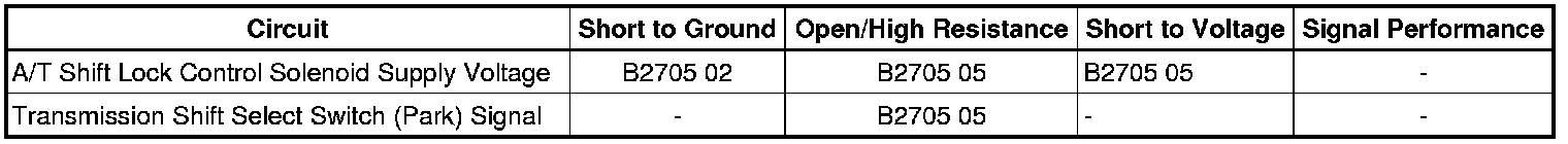 * DTC B2705 05 sets if the automatic transmission shift lock control solenoid control circuit is open or shorted to voltage.