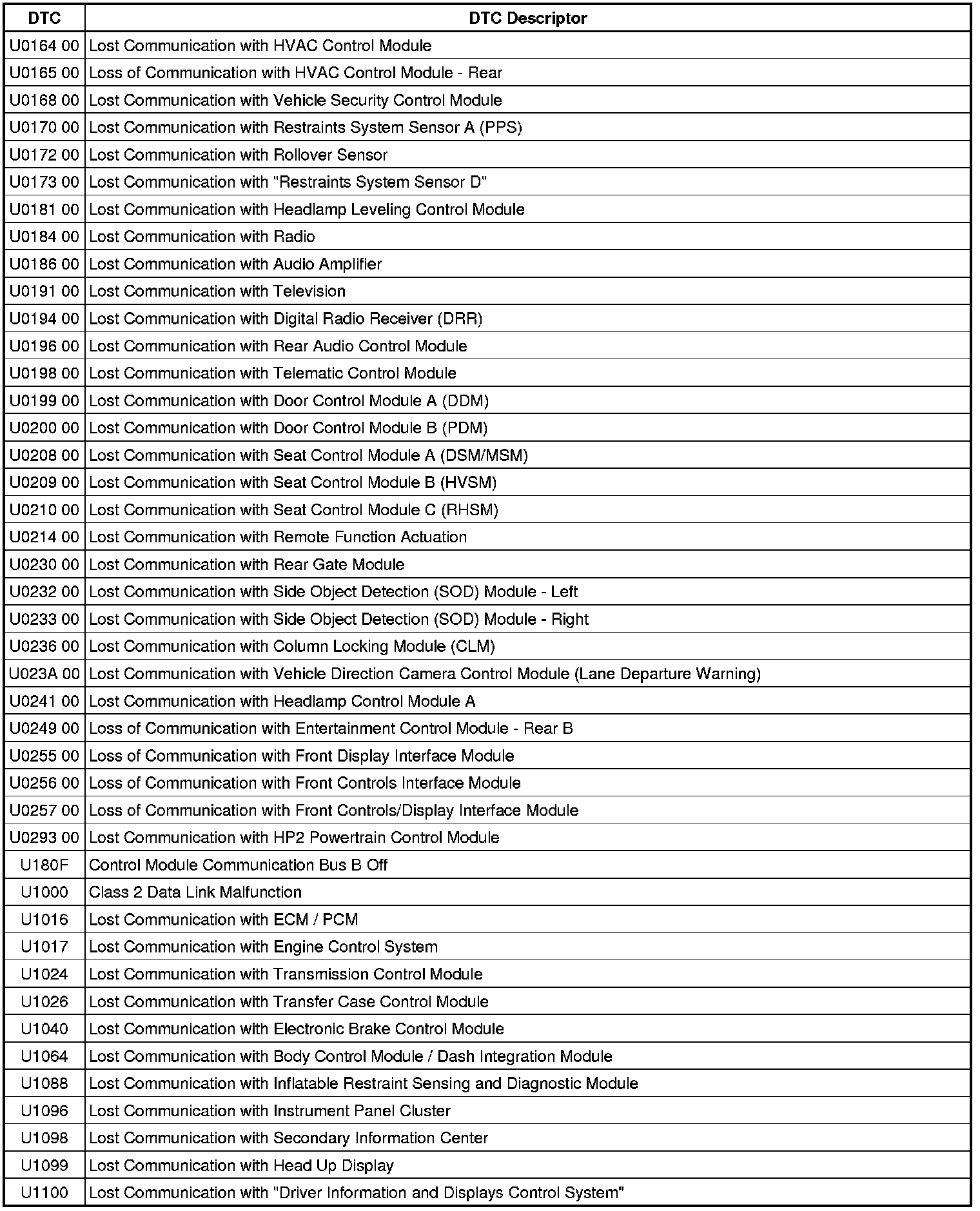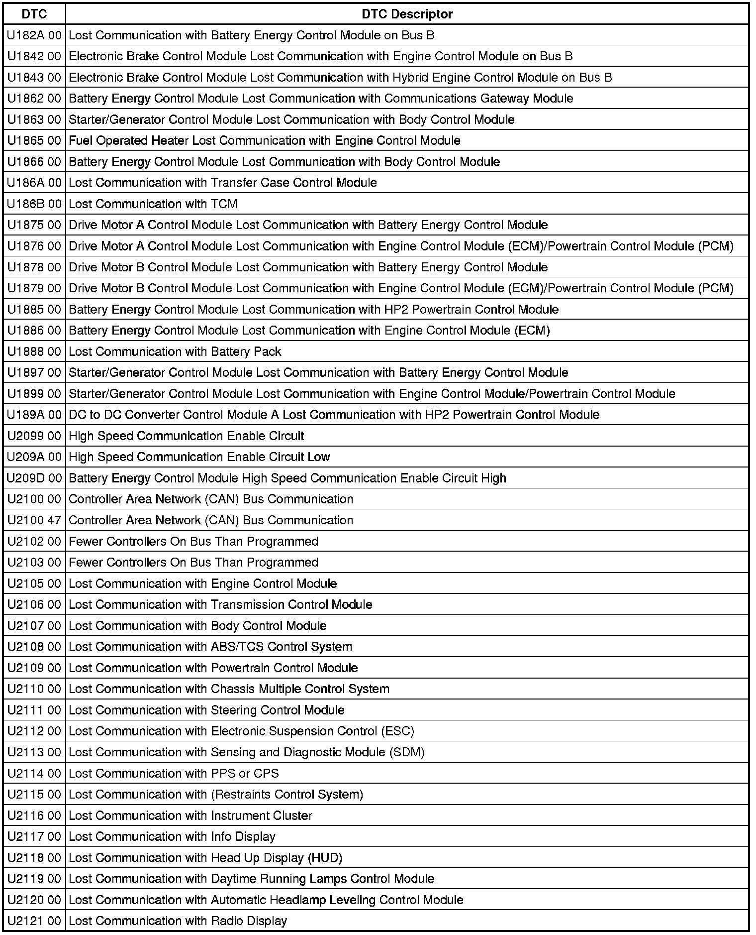 This list includes all Data Communications related U-code DTCs in alphanumeric order with descriptors for all modules. Not all DTCs listed will be applicable to all vehicles.