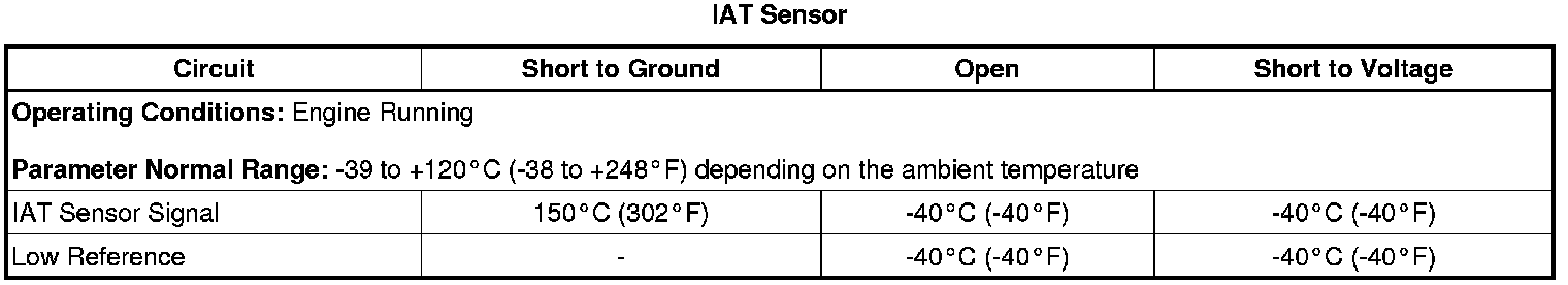 3. Engine running, observe the scan tool IAT Sensor parameter. The reading should be between -39 to +120°C (-38 to +248°F) depending on the current ambient temperature and the vehicle operating conditions.