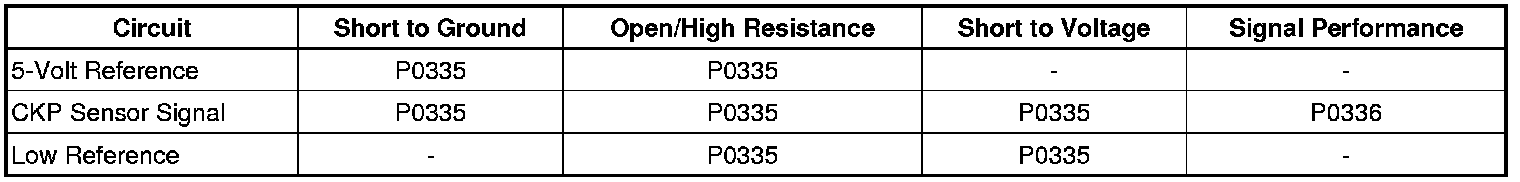 The crankshaft position (CKP) sensor circuits consist of an engine control module (ECM) supplied 5-volt reference circuit, low reference circuit, and an output signal circuit. The CKP sensor is an internally magnetic biased digital output integrated circuit sensing device. The sensor detects magnetic flux changes of the teeth and slots of a 58-tooth reluctor wheel on the crankshaft. Each tooth on the reluctor wheel is spaced at 60-tooth spacing, with 2 missing teeth for the reference gap. The CKP sensor produces an ON/OFF DC voltage of varying frequency, with 58 output pulses per crankshaft revolution. The frequency of the CKP sensor output depends on the velocity of the crankshaft. The CKP sensor sends a digital signal, which represents an image of the crankshaft reluctor wheel, to the ECM as each tooth on the wheel rotates past the CKP sensor. The ECM uses each CKP signal pulse to determine crankshaft speed and decodes the crankshaft reluctor wheel reference gap to identify crankshaft position. This information is then used to determine the optimum ignition and injection points of the engine. The ECM also uses CKP sensor output information to determine the camshaft relative position to the crankshaft, to control camshaft phasing, and to detect cylinder misfire.