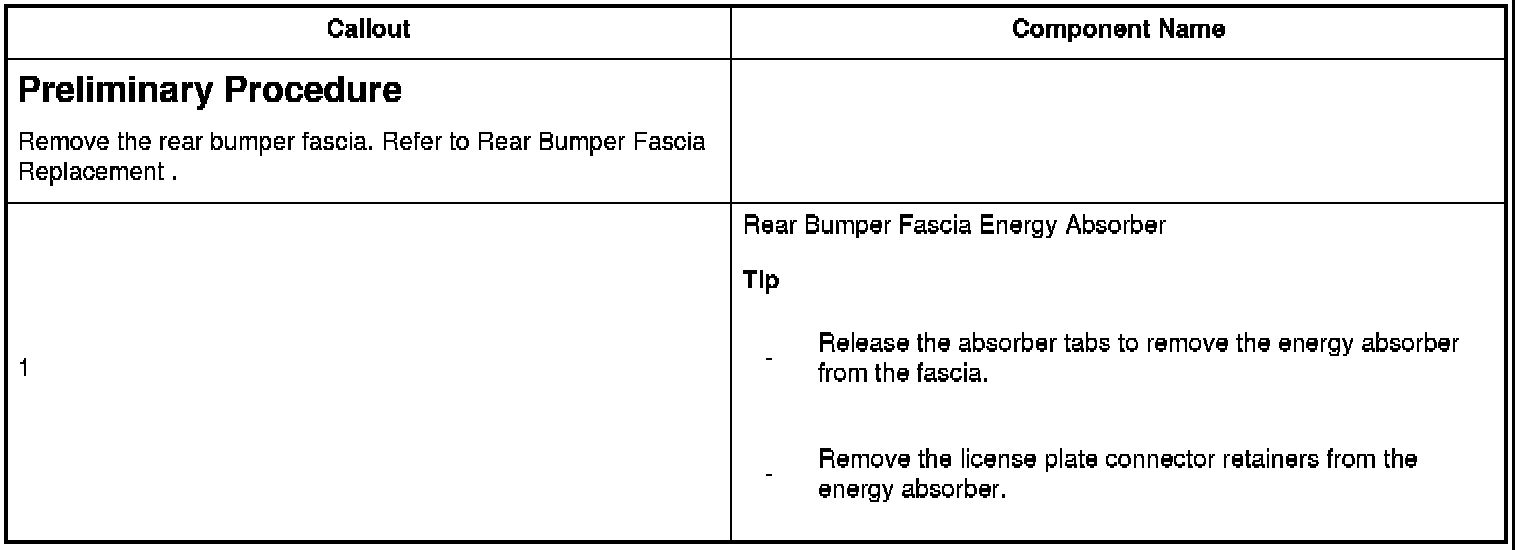 -Release the absorber tabs to remove the energy absorber from the fascia.-Remove the license plate connector retainers from the energy absorber.