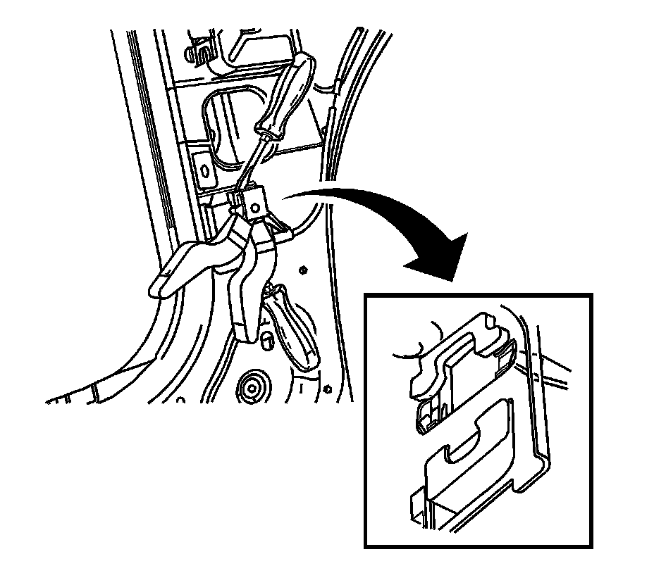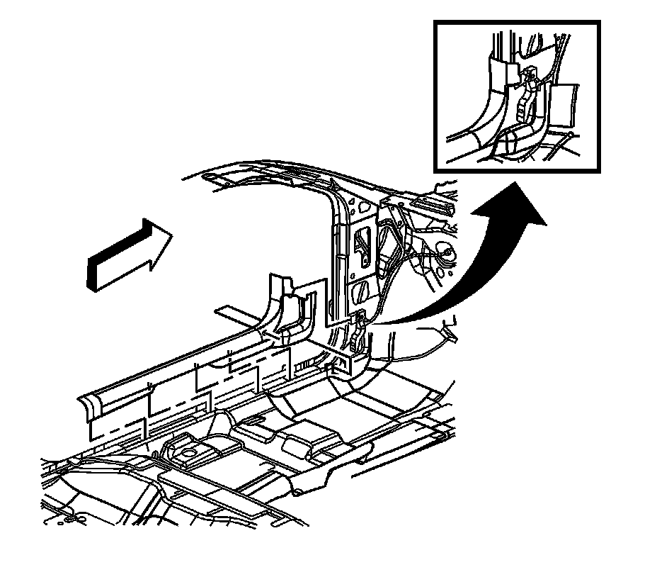 4. Inside the vehicle, remove the left front carpet retainer. Refer to Front Side Door Opening Floor Carpet Retainer Replacement (Coupe) (Service and Repair)Front Side Door Opening Floor Carpet Retainer Replacement (Sedan) (Service and Repair).