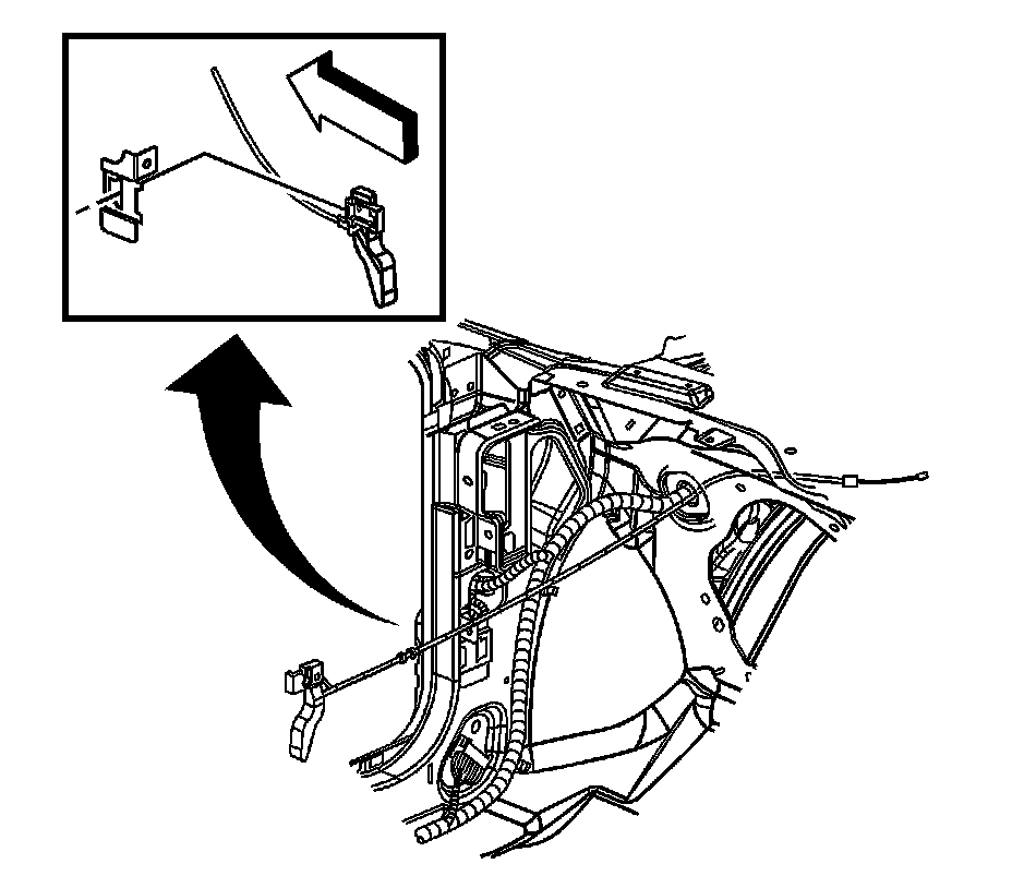 2. Remove the release cable from the latch. Note the routing of the hood cable in the engine compartment for installation.