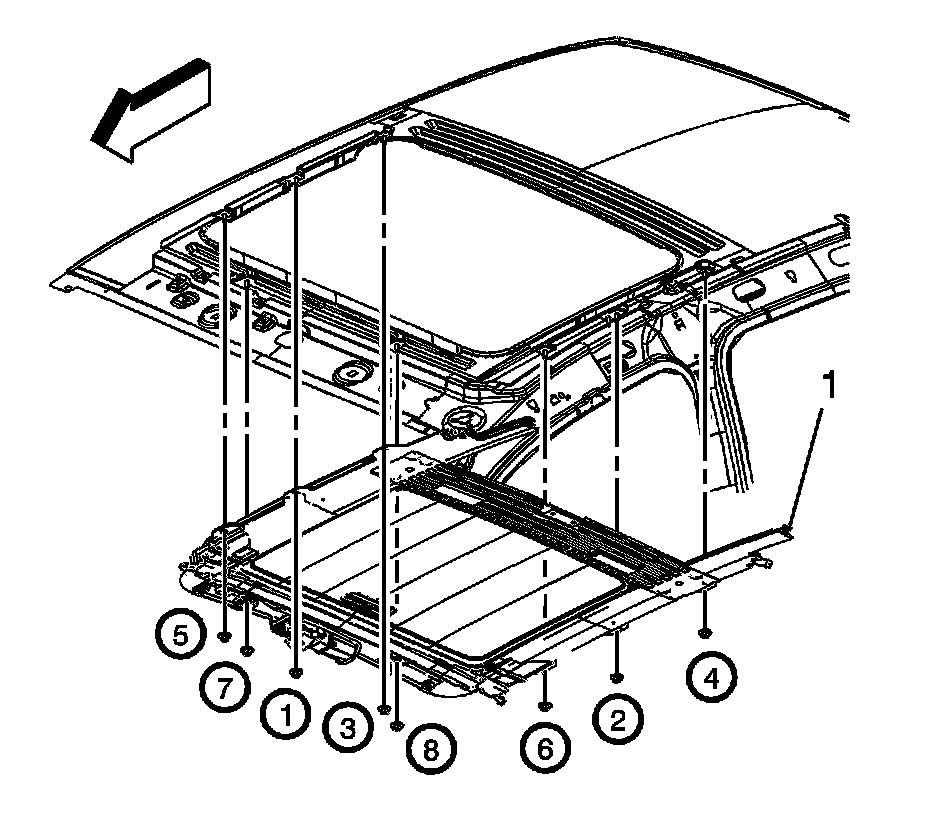 3. Install the remaining sunroof module (1) nuts to the module in sequence (3-8) and tighten to 10 Nm (89 lb in).