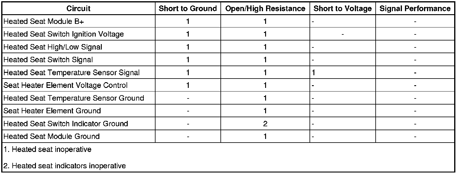 • If the test lamp is always OFF, test the signal circuit for a short to ground or an open/high resistance. If the circuits test normal, test or replace the heated seat switch.