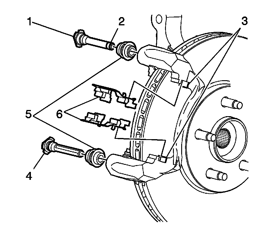 3. Remove the disc brake pad retainers (6) from the brake caliper bracket.