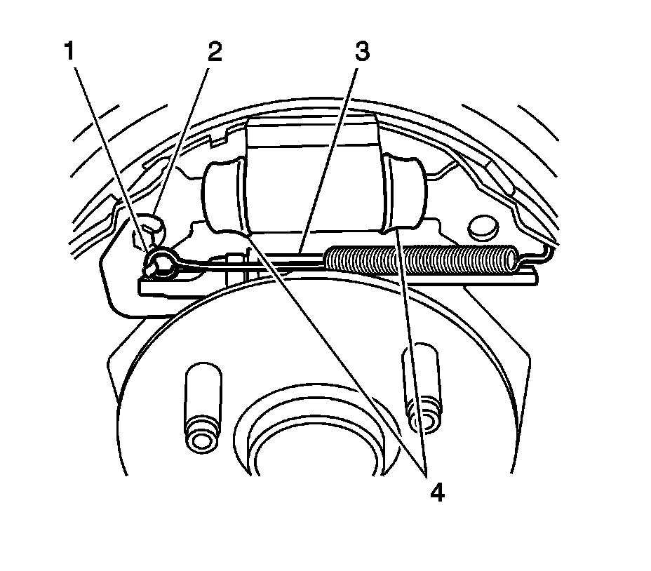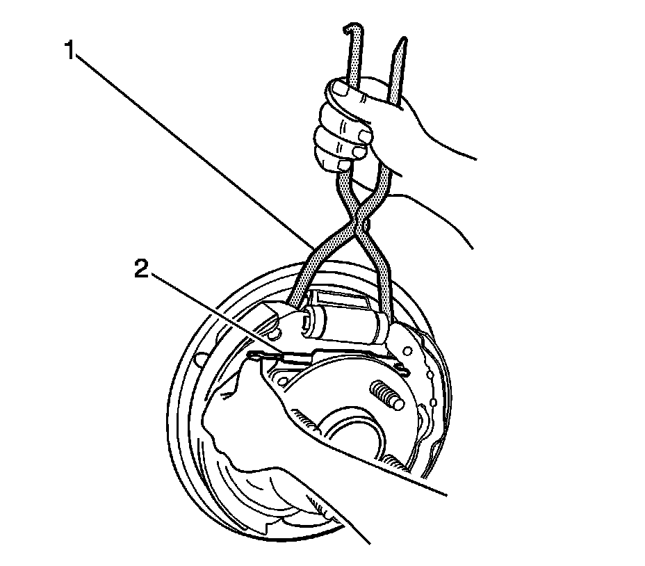4. Remove the adjuster spring (1). Disengage the adjuster spring hook end from the tab on the adjuster actuator lever (2), then release the spring from the brake shoe web hole.
