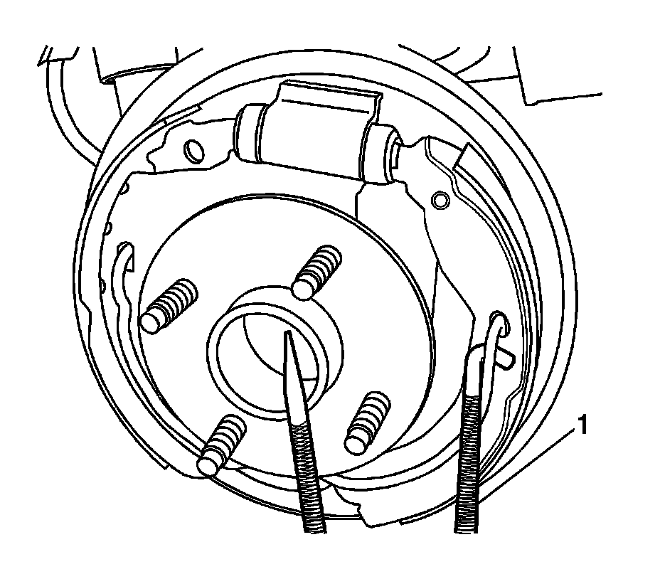 2. Position the hook end of the J 38400 (1) under the universal spring and lightly pull the universal spring end out while installing the leading brake shoe. Ensure that the universal spring engages the brake shoe web hole.