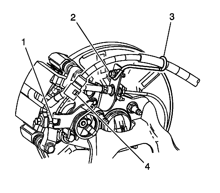 10. Release the retaining tabs (4) securing the park brake cable to the bracket on the caliper.