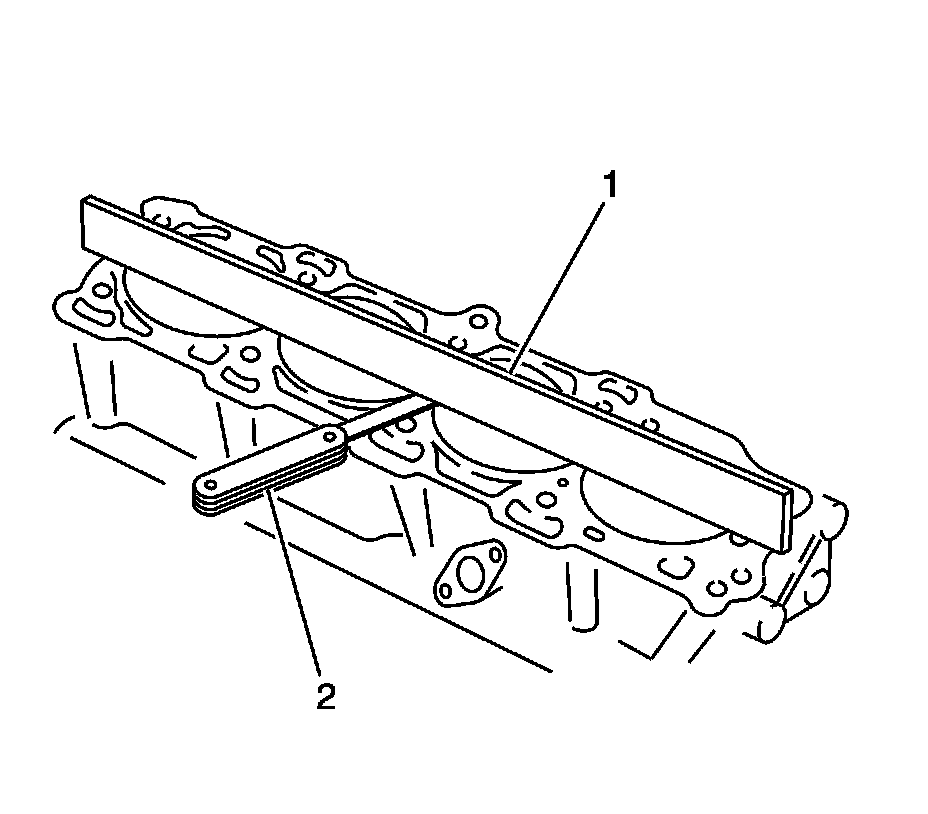 8. Use a straight edge (1) and a feeler gage (2) to check the deck surface for flatness. Carefully machine minor irregularities. Replace the block if more than 0.254 mm (0.010 in) must be removed.