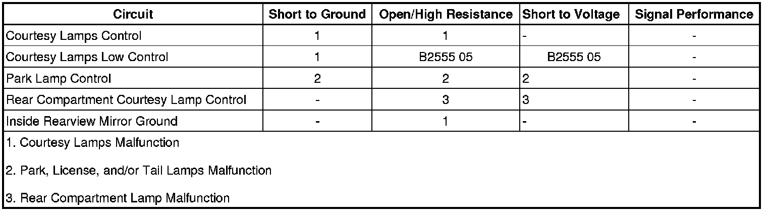 • If the courtesy lamps do not illuminate when commanded, refer to Illuminated Entry Lamps Malfunction.