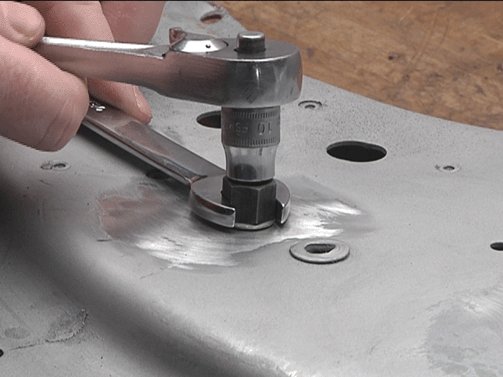 7. Using a wrench on the rivet stud tool, and a socket on the M6 nut, secure the M6 conductive rivet stud.