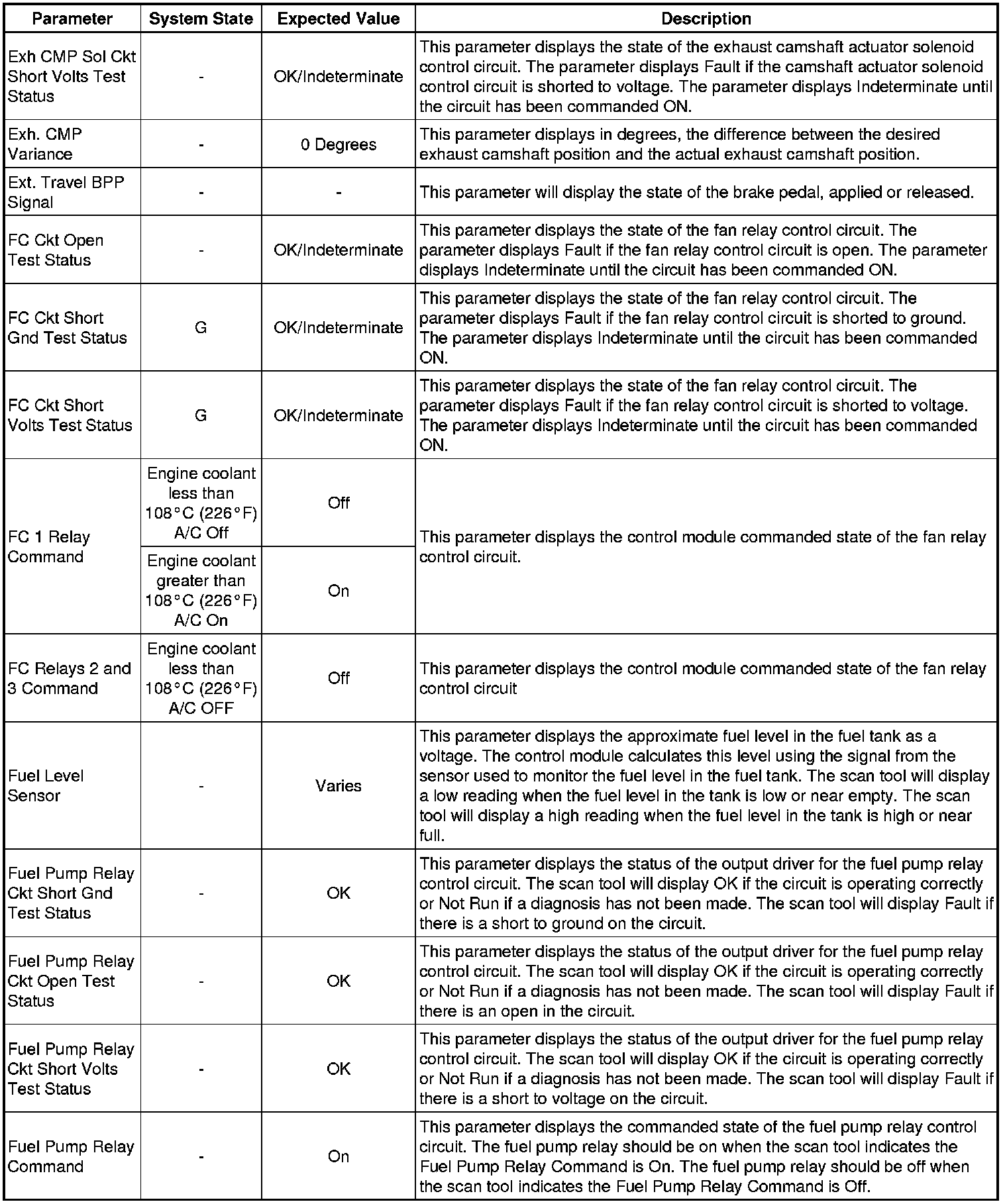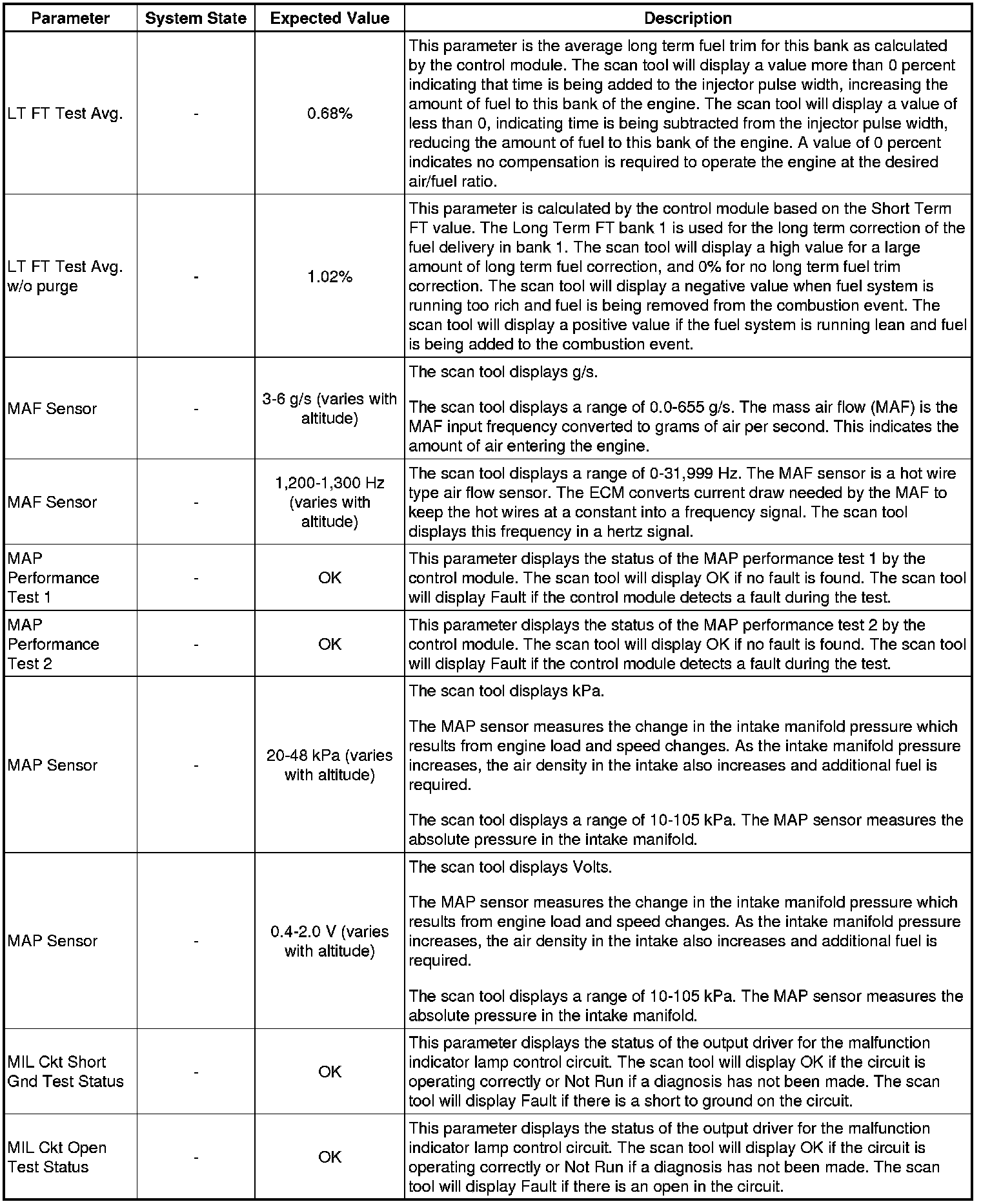 Only the parameters listed below are referenced in this service manual for use in diagnosis. If all values are within the typical range described below, refer to Symptoms - Engine Controls (- Symptoms - Engine Controls) for the 2.4L engine for diagnosis.