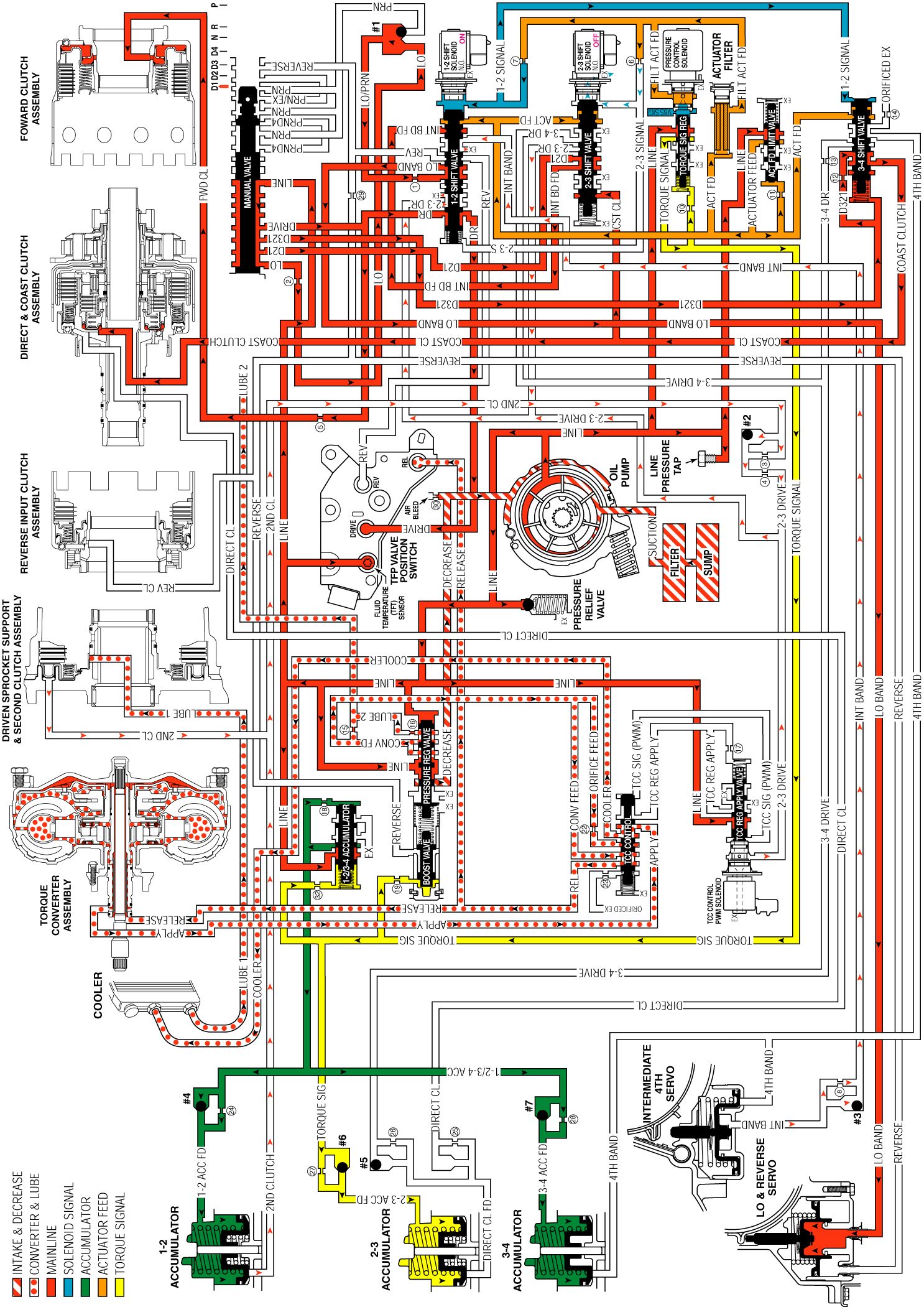 Second clutch feed fluid exhausts from the 1-2 accumulator, and the fluid exhausts past the #2 checkball and through the 2-3 drive fluid circuit. The 1-2 accumulator feed fluid fills the 1-2 accumulator as the second clutch fluid exhausts.