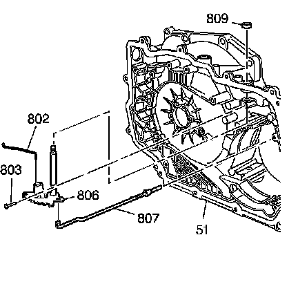 3. With the manual valve to detent lever link (802) and the parking lock actuator assembly (807) attached, install the manual shaft and detent lever assembly (806) into the case.