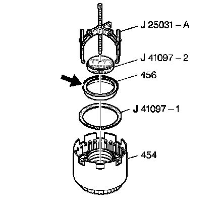 2. Place the J 41097-2 - adapter ring on the inner hub of the reverse clutch housing (454).