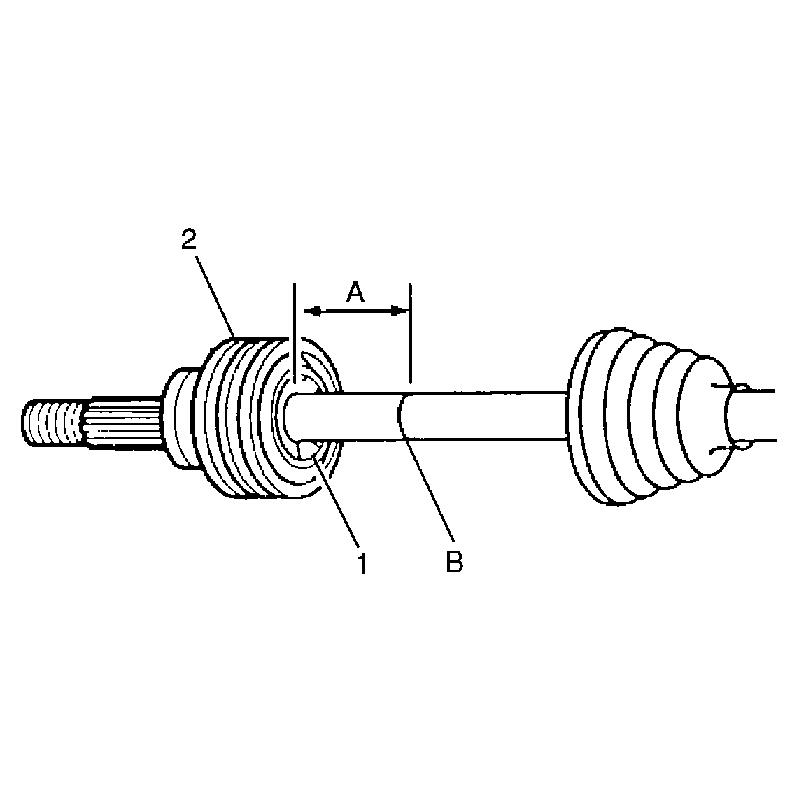 2. Measure the distance between the reference mark (B) and the face of the CV joint inner race (1). Make a note of this measurement (A).