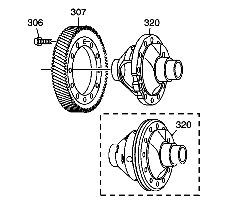 3. Disassemble the differential gear assembly by removing 12 ring gear-to-case bolts (306). Separate the differential case (320) from the ring gear (307).