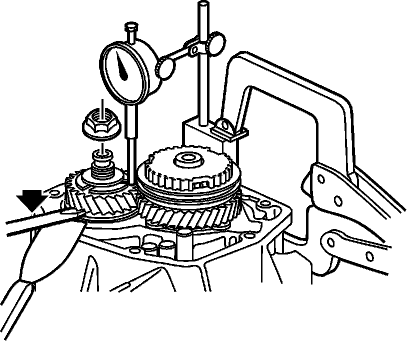 45. Install the J 8001 - indicator set , or equivalent, on top of the 5th driven gear. Engage the 1st gear on the transaxle and engage the 5th gear by pressing down the 5th gear synchronizer sleeve. Install a bolt in the case as shown so that you are not prying against the rear cover sealing surface. Measure the output shaft end play by prying up on the 5th driven gear and watching the dial indicator and tighten the output shaft nut until end play is between 0.06-0.05 mm (0.002-0.002 in).