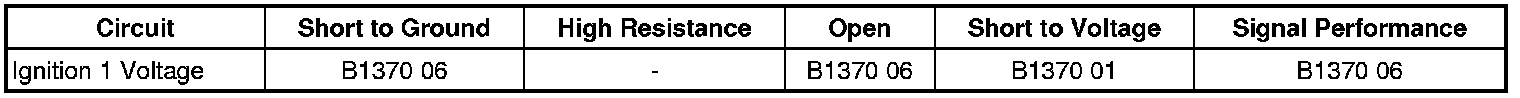 The inflatable restraint sensing and diagnostic module (SDM) monitors the ignition 1 voltage signal from the ignition switch. When the vehicle ignition switch is placed in the RUN or CRANK position the switch supplies voltage to the SDM ignition 1 input terminal. If an open, short to voltage, or short to ground in this SDM ignition 1 circuit is detected then DTC B1370 will set.