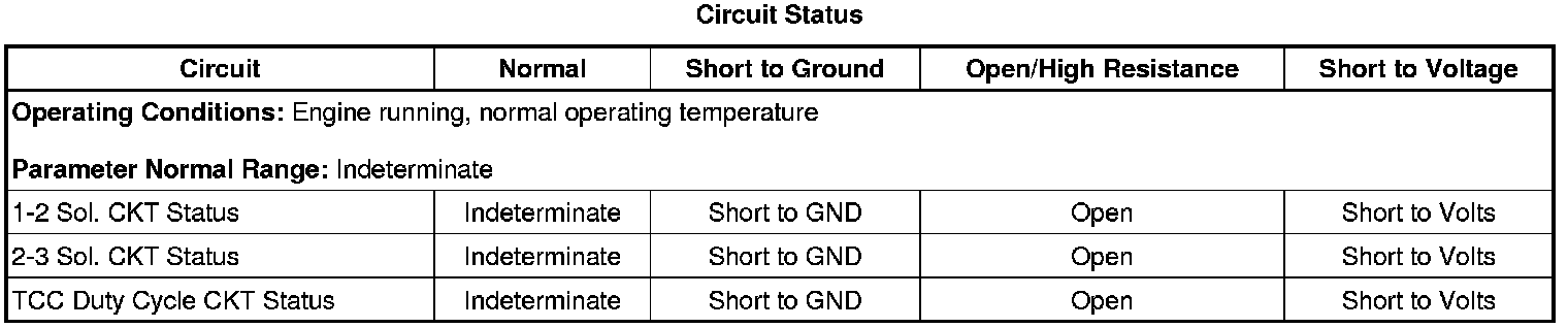 Start and idle the engine. Using the scan tool output controls command the 1-2 SS, 2-3 SS, and TCC PWM solenoid ON and OFF. Observing the CKT Status parameter on the scan tool, ensure the parameter shows OK.