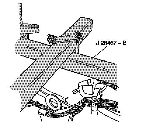 23. Adjust the J 28467-2A radiator shelf tube and the J 28467-6A assemblage lift hook bracket in order to align the hook with the right (rear), front of engine, lift hook bracket located next to the generator.