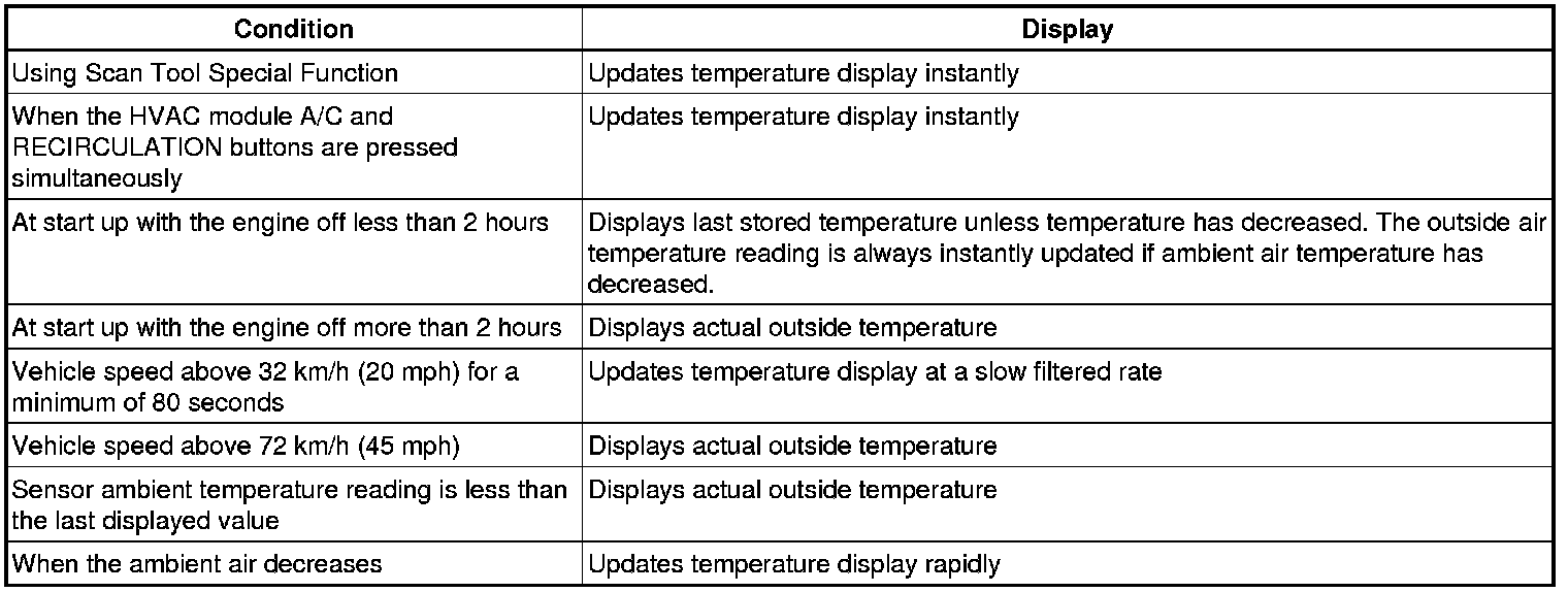A signal and low reference circuit enables the sensor to operate. As the air temperature surrounding the sensor increases, the sensor resistance decreases. The sensor signal voltage decreases as the resistance decreases. The sensor operates within a temperature range between -40 to +101°C (-40 to +215°F). The sensor signal varies between 0-5 volts. The input of the duct air temperature sensors are different from the ambient and inside air temperature sensors. The HVAC control module converts the signal to a range between 0-255 counts. As the air temperature increases the count value will decrease.