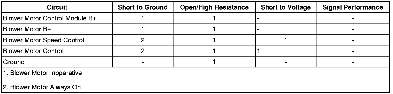 The blower motor control module is an interface between the HVAC control module and the blower motor. The blower motor speed control, battery positive and ground circuits enable the control module to operate. The HVAC control module provides a variable voltage to the blower motor control module to request the selected blower speed. The blower motor control module provides a pulse width modulation (PWM) signal to the blower motor in order to control the blower motor speed. The module supplies 12 volts to the blower motor through the blower motor voltage supply circuit.
