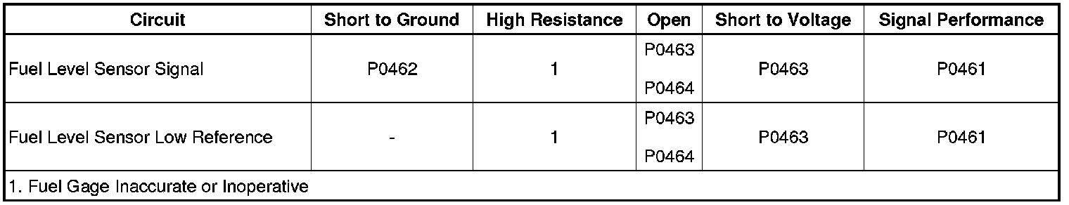 The fuel level sensor changes resistance in response to the fuel level. The engine control module (ECM) monitors the signal circuit of the fuel level sensor in order to determine the fuel level. When the fuel tank is full, the sensor resistance is low and the ECM senses a low signal voltage. When the fuel tank is empty, the sensor resistance is high and the ECM senses a high signal voltage. The ECM uses the signal circuit of the fuel level sensor in order to calculate the percentage of remaining fuel in the tank. The ECM sends the fuel level percentage via serial data circuit to the body control module (BCM). The BCM sends serial data messages to the instrument panel cluster (IPC) in order to control the fuel gage and display the fuel level.