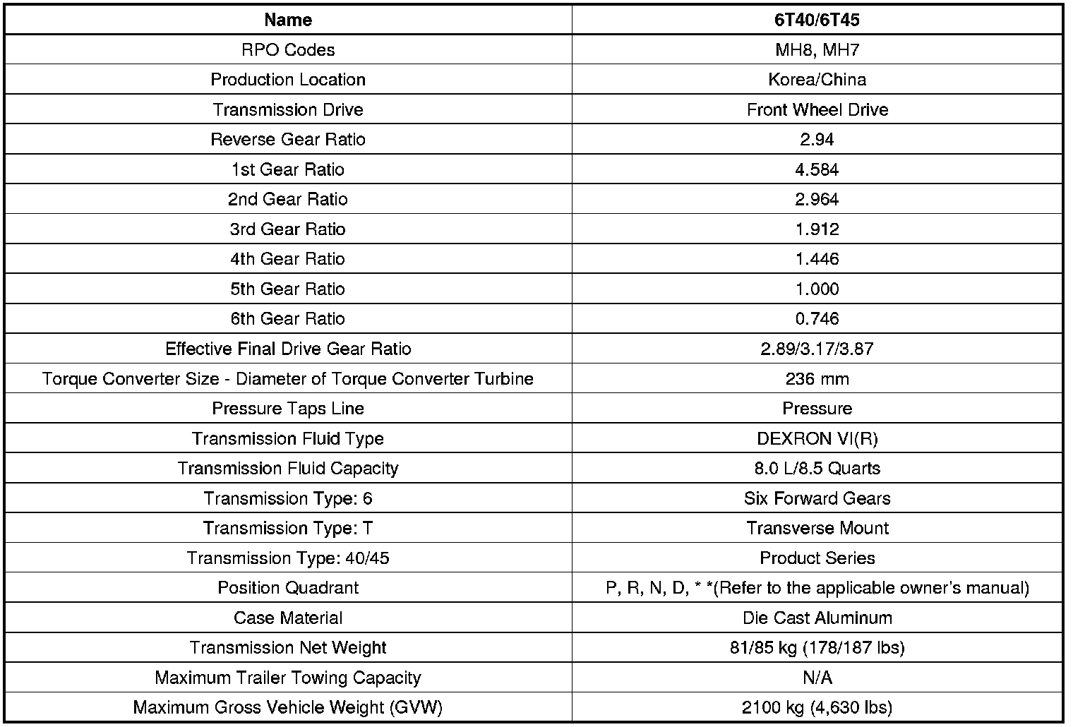 Transmission General Specifications (6T40/45)