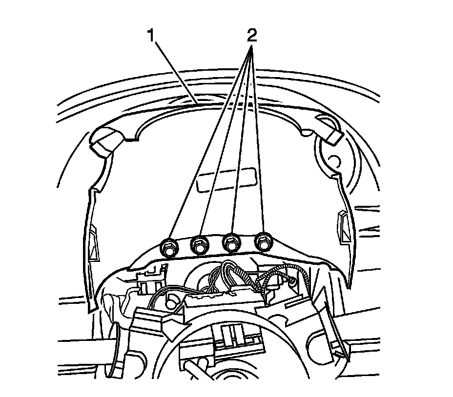 3. Install the upper trim cover (2) onto the steering column. Install the instrument panel seal retaining nuts (1) onto the upper trim cover (2).