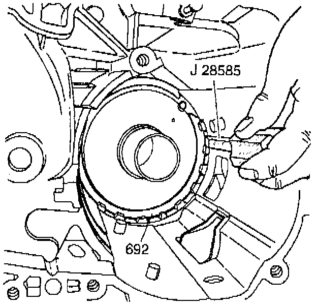 3. Use J 28585 - snap ring remover or a long screwdriver in order to install the snap ring (692) into the case as shown.