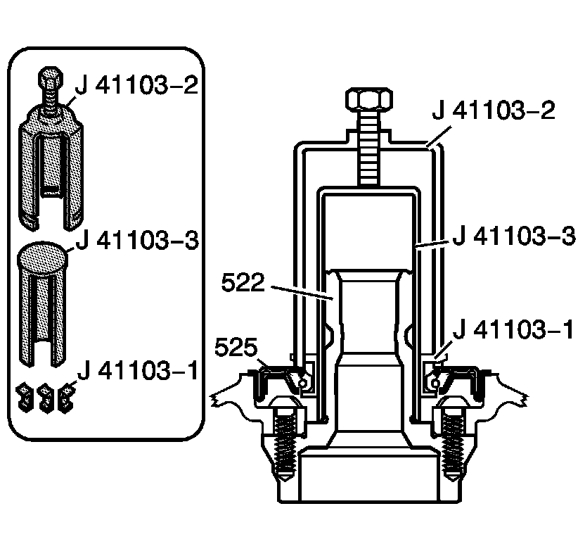 4. Tighten the forcing screw on the J 41103-2 - puller bridge until the J 41103-1 - puller legs remove the torque converter seal (525).