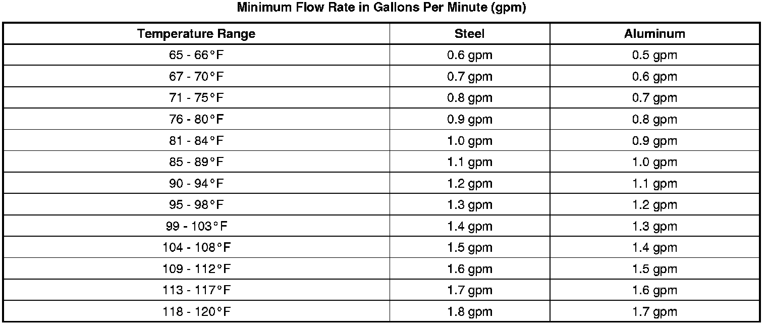 3. Refer to the table below. Using the temperature from step 1, locate on either the Steel MINIMUM Flow Rate table or the Aluminum MINIMUM Flow Rate table the minimum flow rate in gallons per minutes (GPM). Record the minimum flow rate in GPMs and the supply fluid temperature for further reference.
